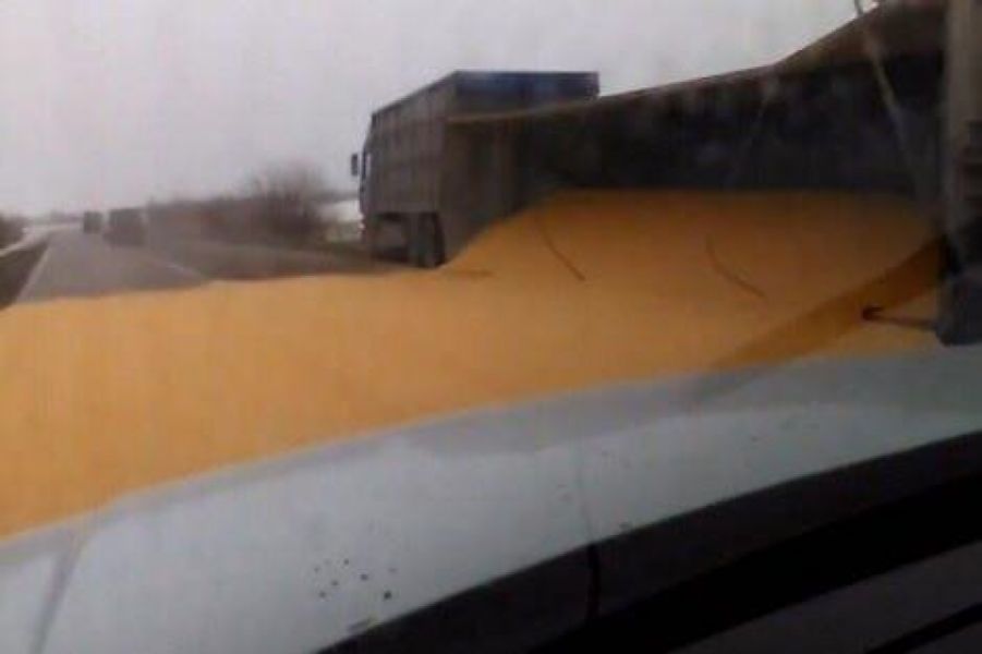 На видео снят перевёрнутый прицеп зерновоза. Зерно рассыпано по всей проезжей части.