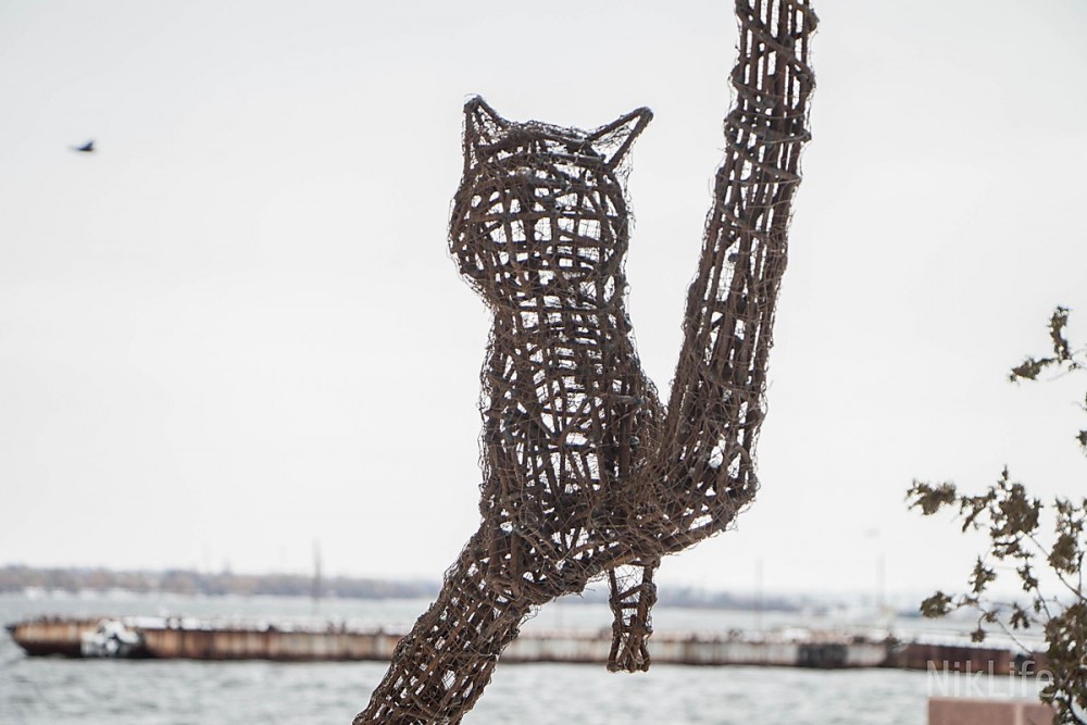 В николаевском яхт-клубе появился новый арт-объект – лавка, украшенная скульптурой кота на фонаре.