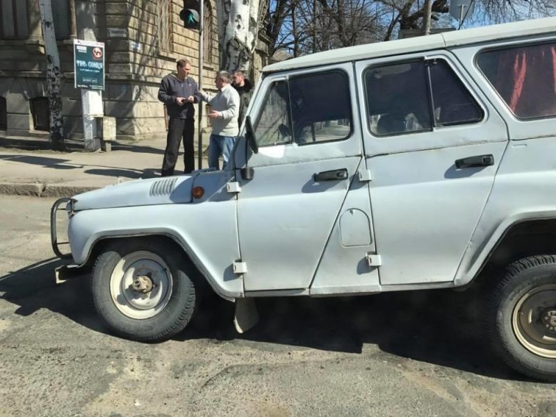 В центре Николаева УАЗ застрял колесом в яме на дороге