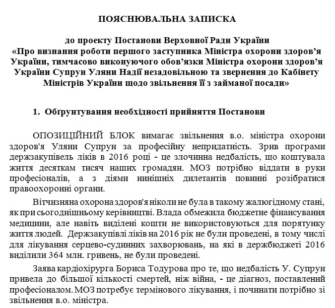 — Власти ограничили бюджетное финансирование медицины, но даже выделенные средства не используются для спасения жизни людей… Заявление кардиохирурга Бориса Тодурова о том, что небрежность В. Супрун привела к большему количеству смертей, чем война — это диагноз, поставленный профессионалом. МЗ нуждается в срочном лечении, и начинать нужно по освобождению и.о. министра, — сказано в документе.