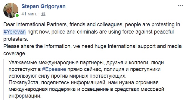 Армянский правозащитник Степан Григорян призвал международное сообщество оказать поддержку протестующим и опубликовал видео, на котором полиция и «армянские титушки» атакуют участников акции протеста.