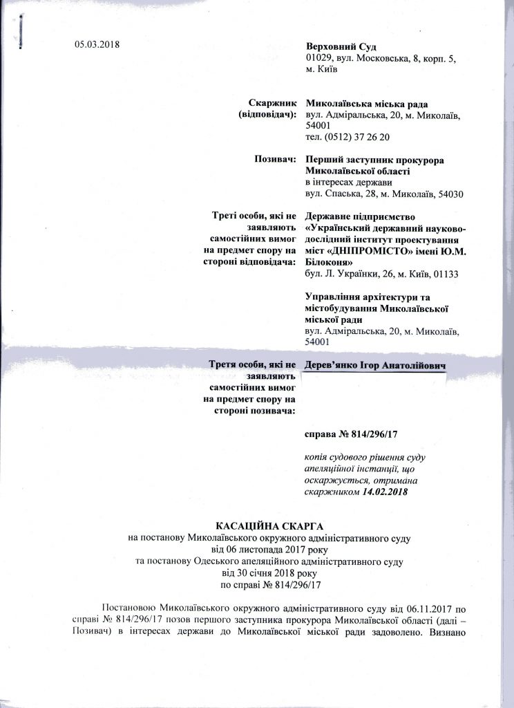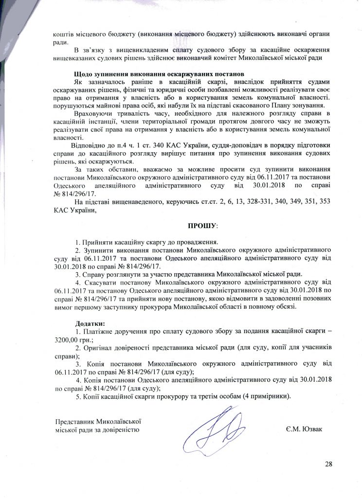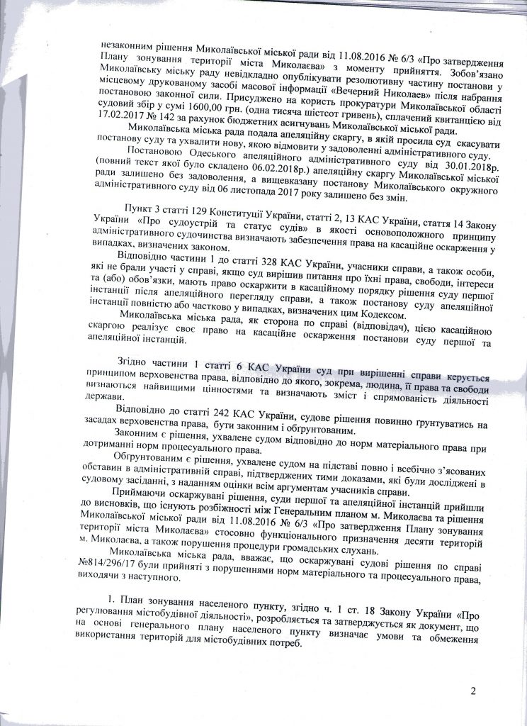 «Принимая обжалуемые решения, суды первой и апелляционной инстанций пришли к выводам, что существуют расхождения между Генеральным планом г.Николаева и решением Николаевского горсовета «Об утверждении Палана зонирования территории города Николаева» относительно функционального назначения 10 территорий г.Николаева, а также нарушение процедуры общественных слушаний. Николаевский горсовет считает, что обжалуемые решения принимались с нарушением норм действующего законодательства», — в частности, сказано в кассации.