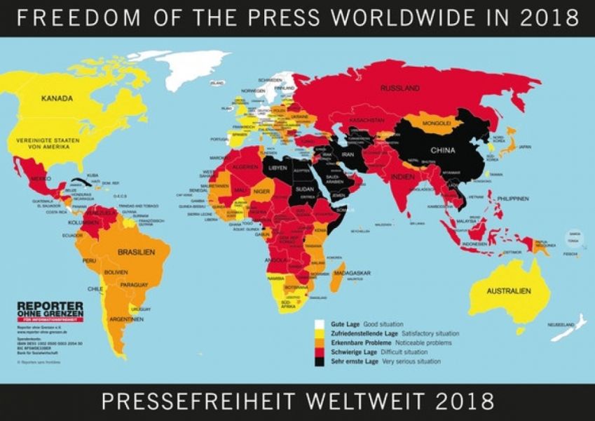 Кроме этого, Репортеры без границ отмечают рост давления на независимые СМИ и государственной пропаганды в России (148 место), усиление цензуры в Китае (176 место) и давление на СМИ в Польше (58 место). Наиболее опасной страной для работы журналистов признана Сирия, где в 2017 году 13 журналистов были убиты из-за профессиональной деятельности.