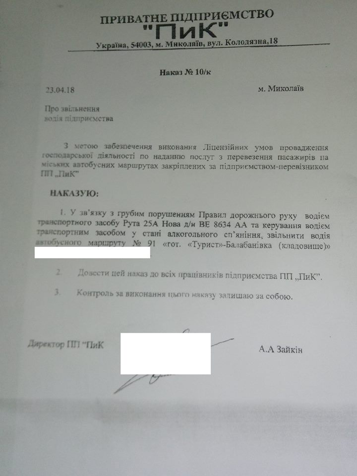 Во исполнение рекомендаций управления транспортного комплекса, связи и телекоммуникаций Николаевского городского совета руководством городского предприятия — перевозчика ЧП "ПиК" расторгнуты договорные отношения с водителем автобуса г/н ВЕ 86-34 АА.