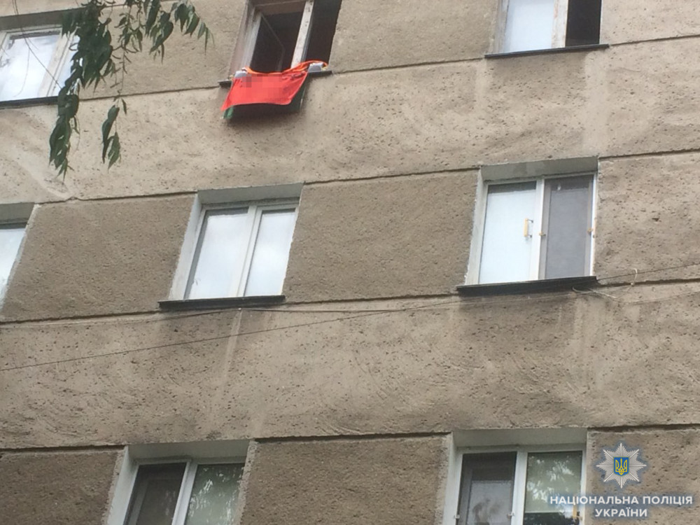 Еще один любитель СССР вывесил советский флаг из окна своей квартиры в многоэтажке на улице Армейской.