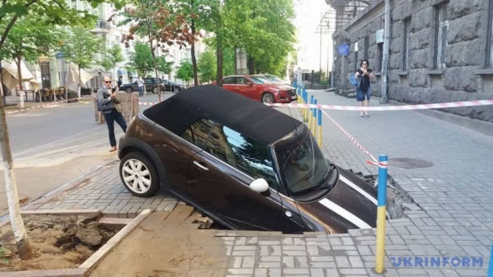 На улице Пушкинской в центре Киева припаркованный на тротуаре автомобиль "Мини Купер" провалился в яму.