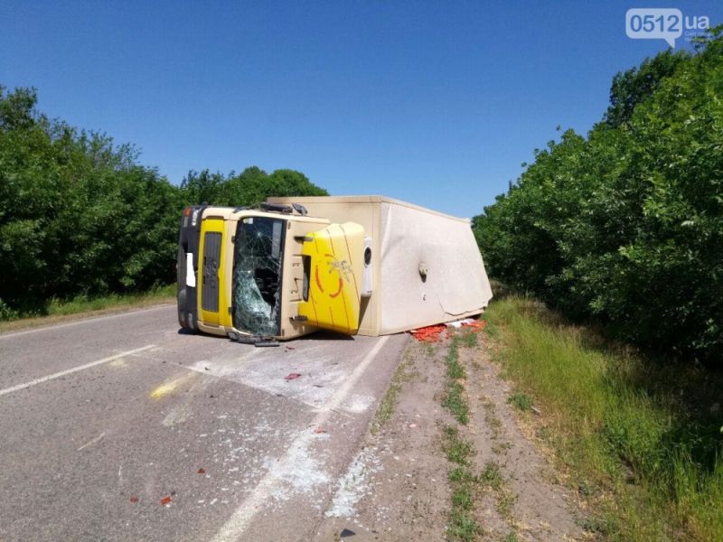 Грузовик двигался со стороны Одессы в сторону Николаева. По дороге у грузовика лопнуло колесо. В следствии чего транспортное средство перевернулось.