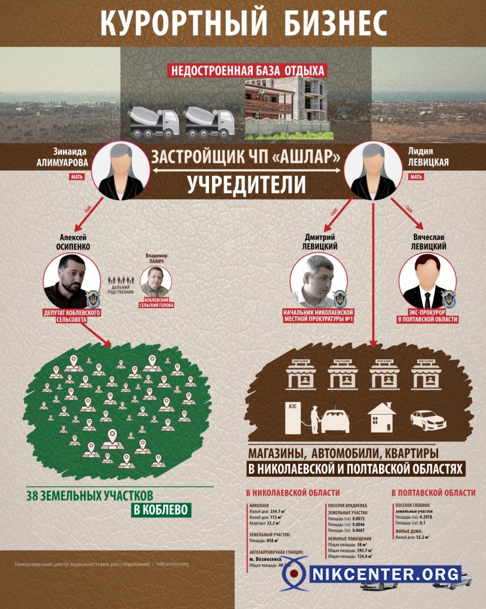 Партнершей мамы прокурора в ЧП "Ашлар" записана иметь местного депутата Алексея Осипенко. Сам Осипенко — дальний родственник Кобливського сельского головы Владимира Панича. В Коблево у депутата Осипенко — 38 земельных участков — все он получил в последние десять лет. А у прокуратуры к депутату-латифундисту — никаких претензий.
