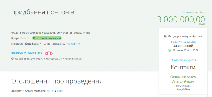 Об этом стало известно на сайте публичных закупок «Prozorro».