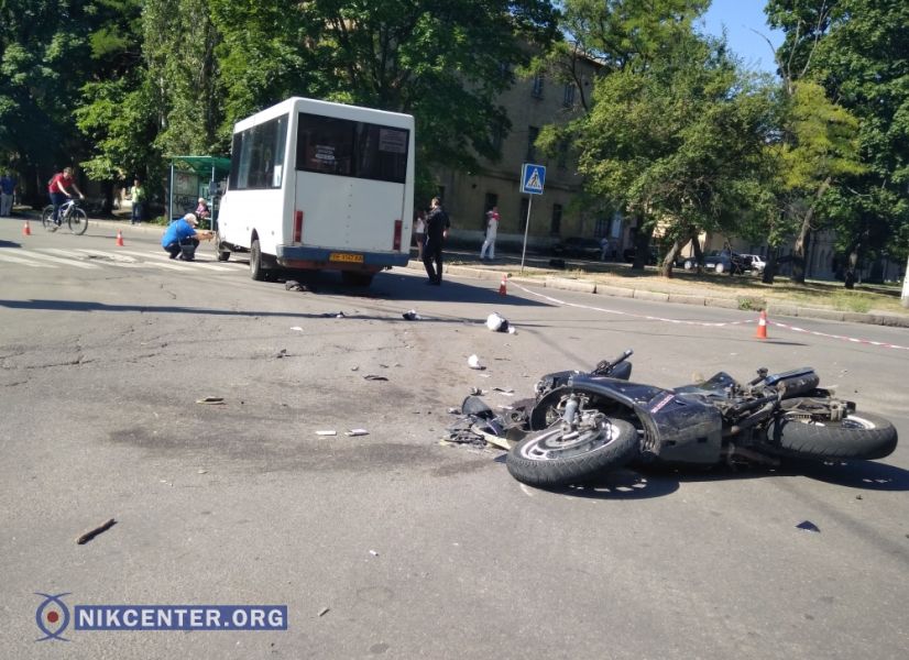 Утром во вторник, 19 июня, в Николаеве на улице Набережной возле проходной завода им. 61 коммунара мотоциклист врезался в маршрутку №82.