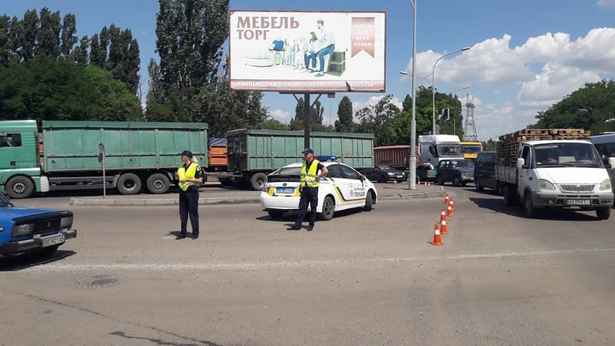 В данный момент на месте работают два экипажа патрульной полиции, которые помогают регулировать движение, а также перепарковывают фуры, которые припаркованы с нарушением.