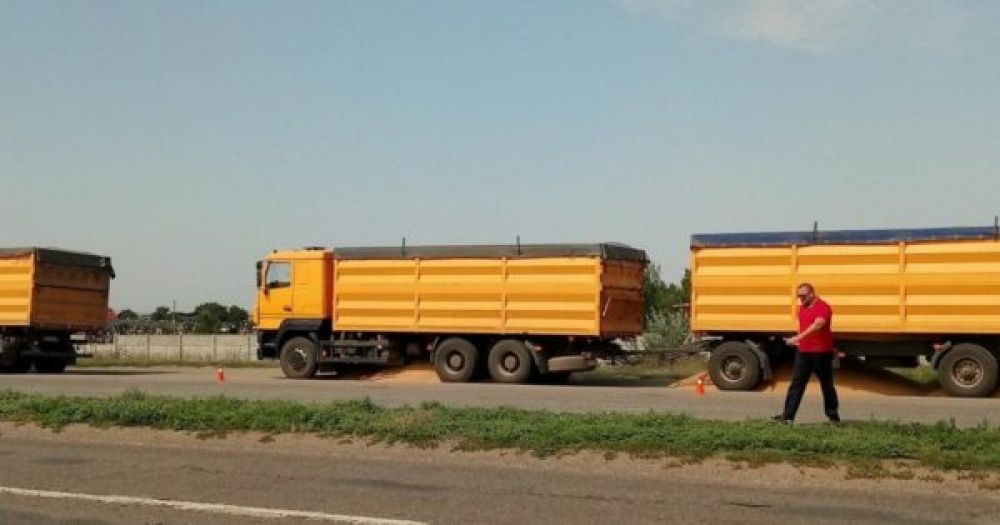 Инцидент произошел на ГВК на Баштанском шоссе сегодня, 2 августа. Две фуры с явным перегрузом отказались взвешиваться, водители начали споры с инспекторами Укртрансбезопасности и представителями «Автоевросилы». На место приехал Виталий Тарабрин, представившийся хозяином ООО «Дионисий» и фермерского хозяйства «Південні лани», открыл борта и высыпал зерно из фур.