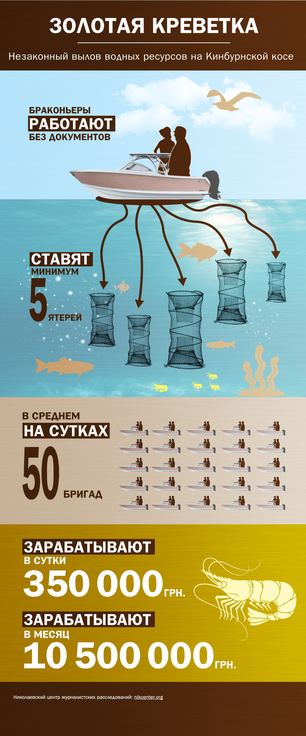 О том, что на Кинбурне происходит массовый незаконный вылов креветки, хорошо знают и в Киеве. Комментируя ситуацию для наших коллег из «Радио Свобода», чиновник Госэкоинспекции Василий Коротецкий озвучил суммы доходов браконьеров: