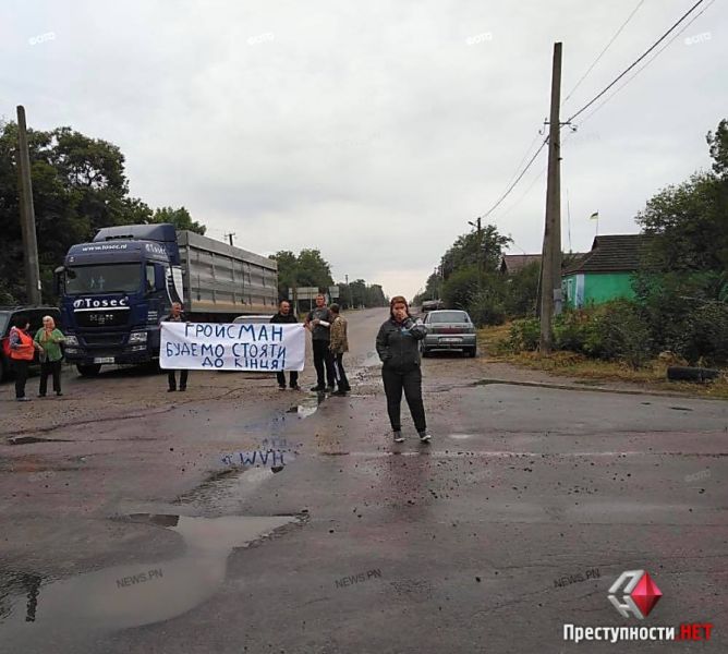 На дорогу вышли около десятка людей. У них в руках плакаты с надписями: «На Николаевщине также живут люди, а не только на Винничине», «Гройсман, будем стоять до конца.