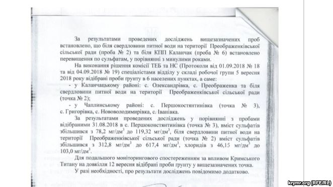 Как следует из ответа на запрос Крым.Реалии, пробы показали, что возле скважины питьевой воды на территории Преображенского сельского совета и возле пункта пропуска «Каланчак» содержание сульфатов в грунте превышено по сравнению с прошлыми годами.