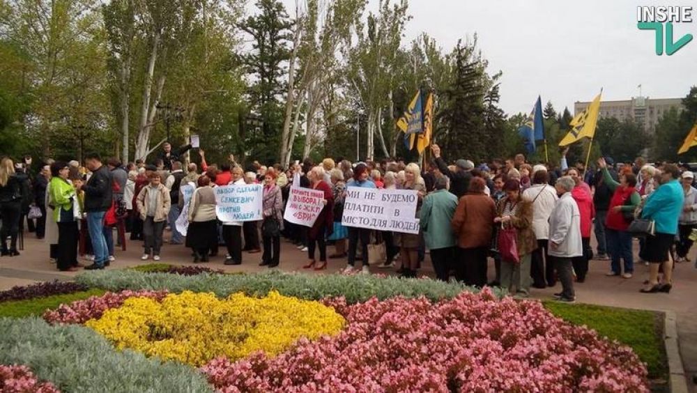 На митинг пришли пенсионеры с изготовленными в типографии транспарантами с надписями: «Сенкевич – верни нам наше законное право избирать управляющую компанию» и «Сенкевич – антинародный мэр». Впрочем, есть и рукописные плакаты, которые также обвиняют Сенкевича во всех грехах. Возле протестующих находится депутат городского совета от «Оппозиционного блока» Лариса Веселовская, которая ранее выступала против новой управляющей компании. На митинг пришел и экс-глава Николаевской ОГА Садыков.