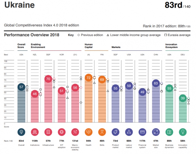 Макроэкономическая стабильность Украины на 131 месте, уровень здравоохранения – 94 место, уровень образования – 46 место, рынок товаров – 73 место.