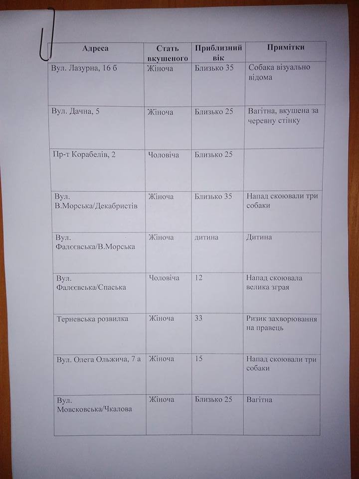 Также директор КП «Центр защиты животных» опубликовал всего один лист из статистики обращений покусанных людей на предприятие, и становится очевидным, что опасности «попасться на зуб» какой-нибудь своре или бродячей собаке-одиночке подвергаются жители всех районов города.