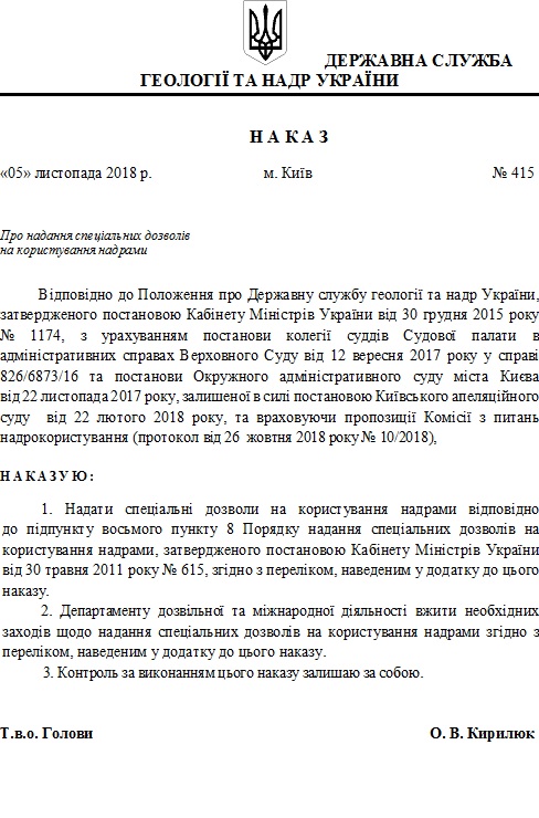 Специальное разрешение дается «АЭСУ» на 3 года (до 5 ноября 2021 года) на геологическое изучение, в том числе опытно-промышленную разработку на Сафоновской и Михайловской площадях в Николаевской области, а также Новогуровской и Сурской площадей в Днепропетровской области.