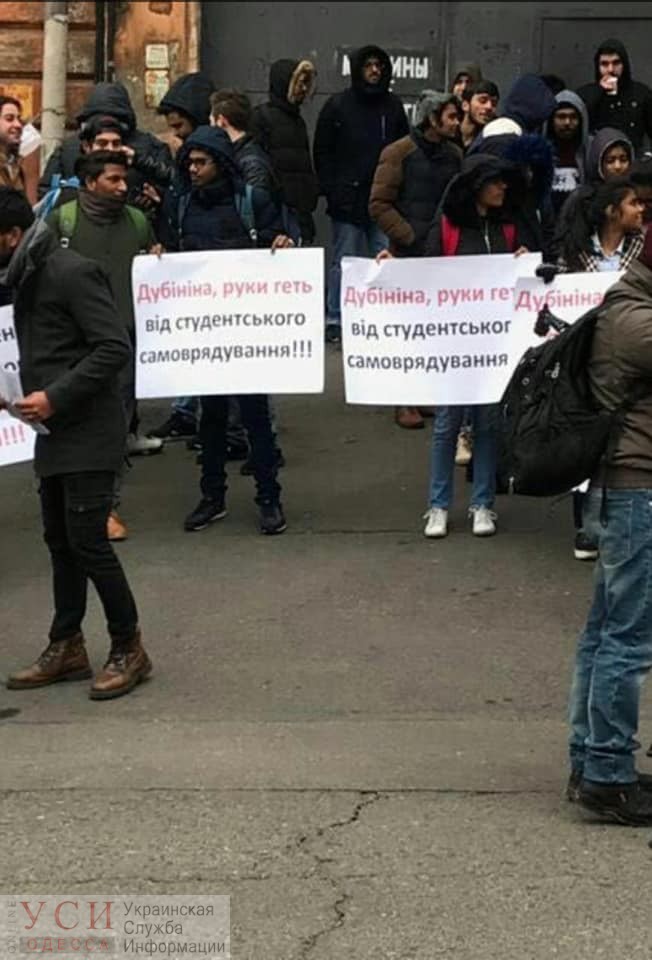 Около 40 студентов из Индии с однотипными плакатами "Дубинина, руки прочь от студенческого самоуправления!!!" вышли на протест под ОНМедУ.