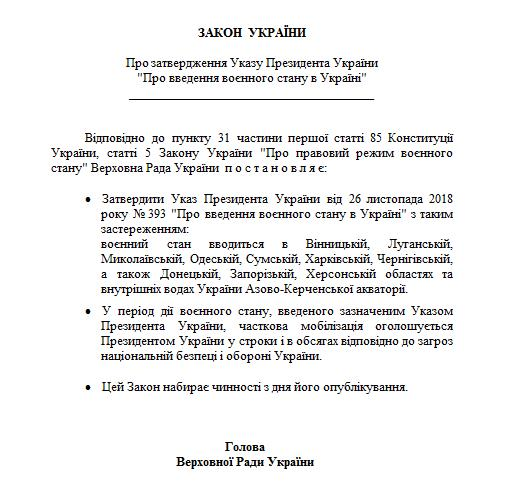 "Утвердить указ президента Украины от 26 ноября 2018 года № 393 "О введении военного положения в Украине" с таким предостережением: военное положение вводится в Винницкой, Луганской, Николаевской, Одесской, Сумской, Харьковской, Черниговской, а также Донецкой, Запорожской, Херсонской областях и внутренних водах Украины Азово-Керченской акватории", – говорится в тексте документа.
