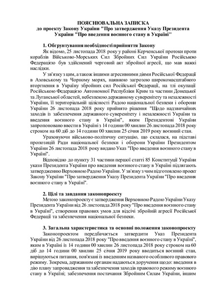 В пояснительной записке отмечается, что законопроектом предполагается утвердить указ президента о введении военного положения, которым в Украине с 14:00 26 ноября 2018 года сроком на 30 суток до 14:00 26 декабря 2018 года вводится военное положение, решаются вопросы, связанные с введением названного особого правового режима.