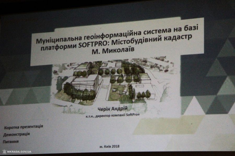 Разработку презентовал директор компании SoftPro +, кандидат технических наук Андрей Черин. По его словам, геоинформационная система Градостроительный кадастр — это украинская разработка, которая построена на открытых системах, постоянно обновляется и динамично развивается.