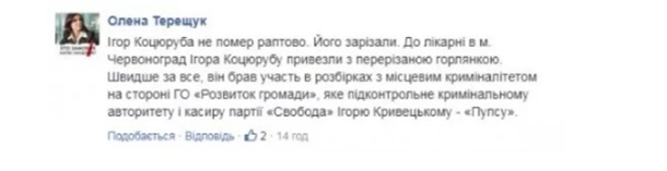 Об убийстве Игоря Коцюрубы также сообщила Елена Терещук, активистка ОО Антикоррупционная платформа. В разговоре с СМИ Елена Терещук заявила, что получила информацию об убийстве от сотрудника правоохранительных органов и одного из членов ОО Развитие общества, однако отказалась от дальнейших комментариев.