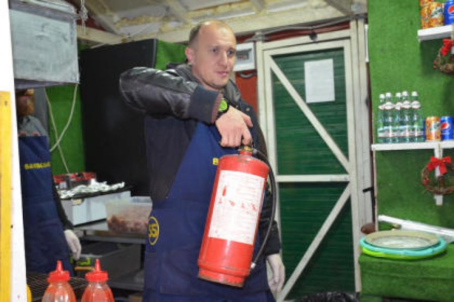 Участники рейда общались с работниками торговых киосков — деревянных домиков — на наличие и исправность первичных средств пожаротушения, инструктировали о принятии первоочередных действий в случае возникновения пожара. Особое внимание уделили вопросу монтажа электропроводки, подключению электрооборудования, а также недопустимости использования газовых баллонов во временных деревянных сооружениях и местах массового пребывания людей.