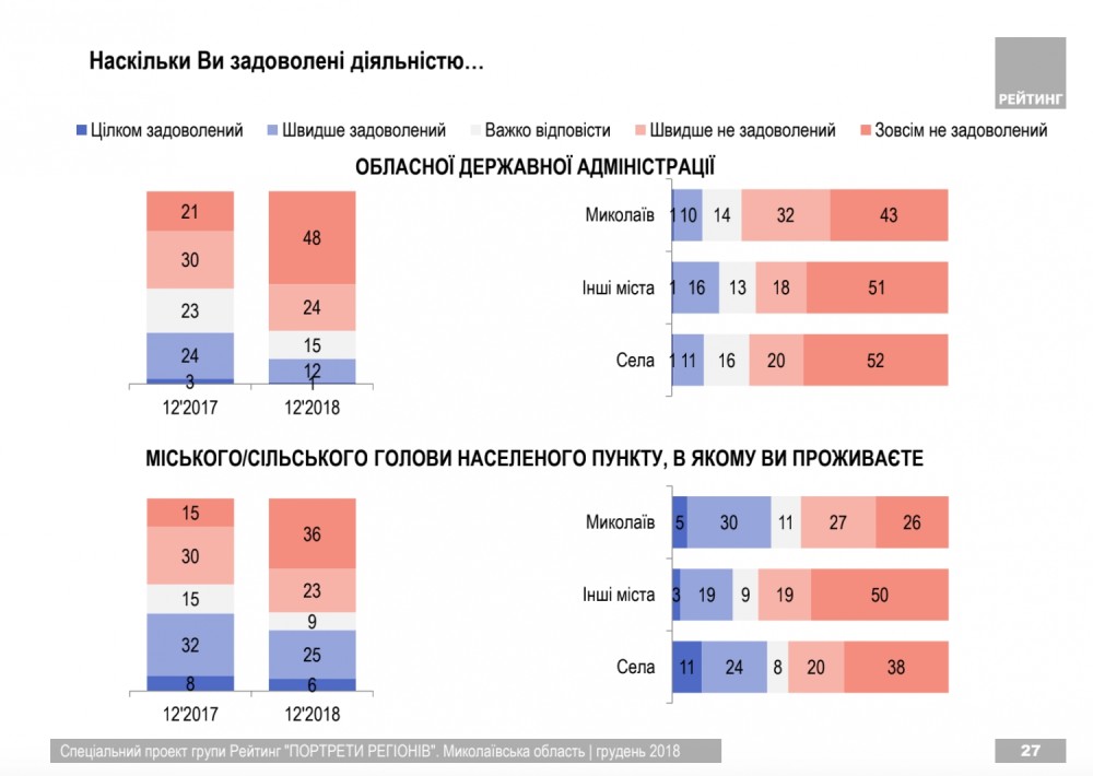 Также за год упал уровень удовлетворенности деятельностью городского / сельского главы на территории Николаевской области – с 40% до 32%).