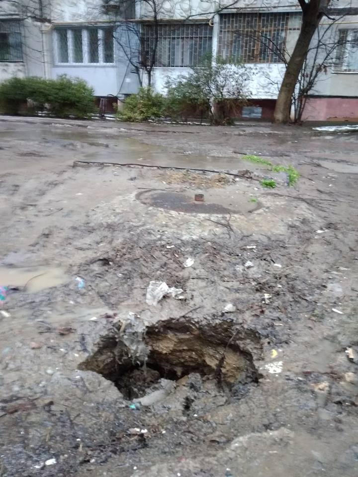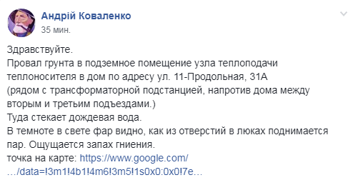 «Здравствуйте. Провал грунта в подземное помещение узла теплоподачи теплоносителя в дом по адресу ул. 11-Продольная, 31А (рядом с трансформаторной подстанцией, напротив дома между вторым и третьим подъездами.) Туда стекает дождевая вода. В темноте в свете фар видно, как из отверстий в люках поднимается пар. Ощущается запах гниения», — сообщает Андрей.