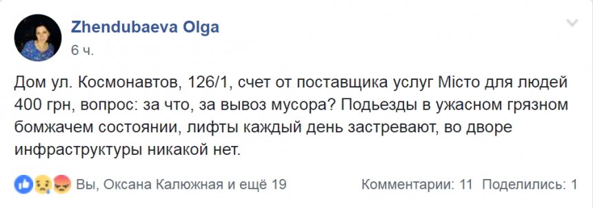 «Дом ул. Космонавтов, 126/1, счет от поставщика услуг Місто для людей 400 грн, вопрос: за что, за вывоз мусора? Подьезды в ужасном грязном бомжачем состоянии, лифты каждый день застревают, во дворе инфраструктуры никакой нет», — написала Zhendubaeva Olga.