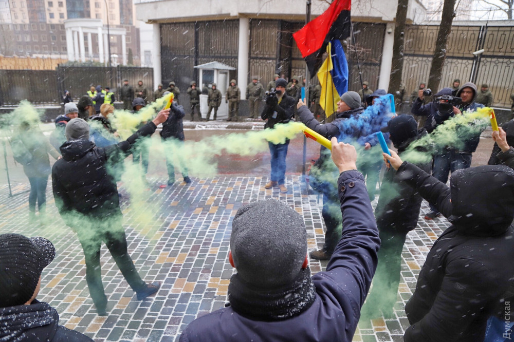 Как передает «Думская», митингующие хотели испачкать забор и ворота диппредставительства красной краской, символизирующей кровь, но правоохранители не дали им этого сделать. В итоге краска разлилась на асфальт и участников акции.