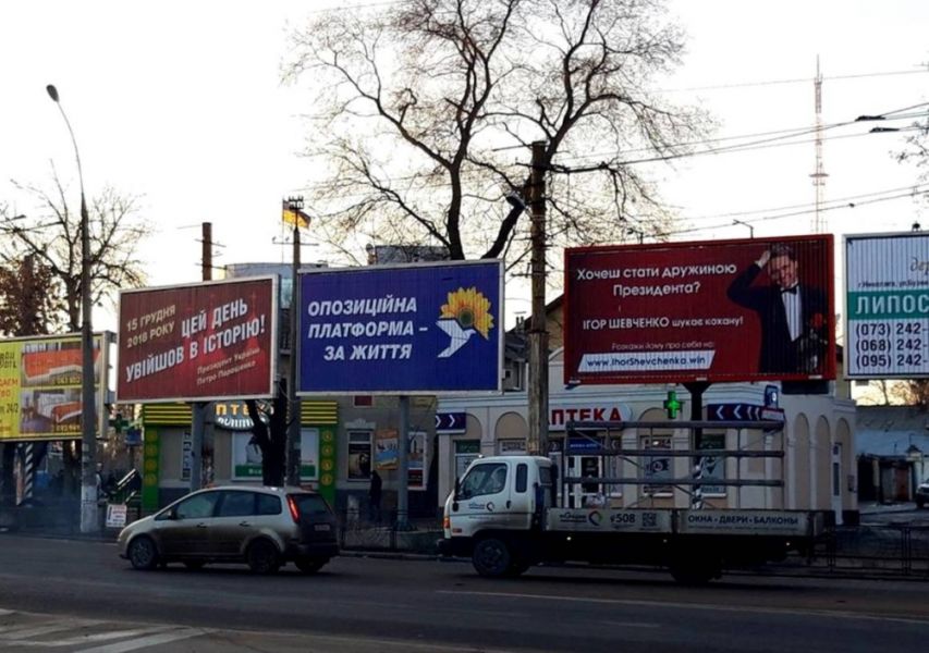 По состоянию на 18 января носитель, на котором размещалась политическая реклама Андрея Садового, заклеенный белым полотном. Изображение Игоря Шевченко с билборда тоже исчезло, вместо него появилась «Оппозиционная платформа — За жизнь». Однако рядом находится еще одна рекламная конструкция с надписью «Хочешь стать женой Президента? Игорь Шевченко ищет любимую!». А на месте билборда с политической рекламой от Сергея Каплина теперь изображён Андрей Садовый, надпись «Единственный шанс на изменения именно сейчас», в нижнем углу находится информация, что заказчиком является О. В. Лаврик, печать осуществило ООО «АЛЕРО 2» тиражом 38 штук.