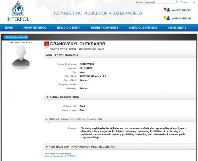 Отмечается, что ищут предпринимателя по просьбе правоохранителей Израиля, которые обвиняют Грановского в подделке корпоративной документации, отмывании денег и мошенничестве.