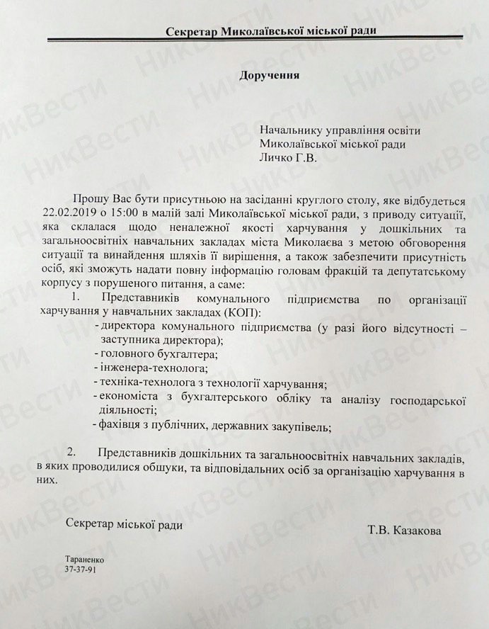 В пятницу, 22 февраля, в малом зале Николаевского городского совета состоится заседание круглого стола по вопросу сложившейся ситуации ненадлежащего качества питания в детских садах и школах Николаева. Как говорится в поручении секретаря горсовета Татьяны Казаковой к начальнику управления образования Анне Лычко, на круглом столе будет обсуждаться ситуация и поиск путей ее решения.