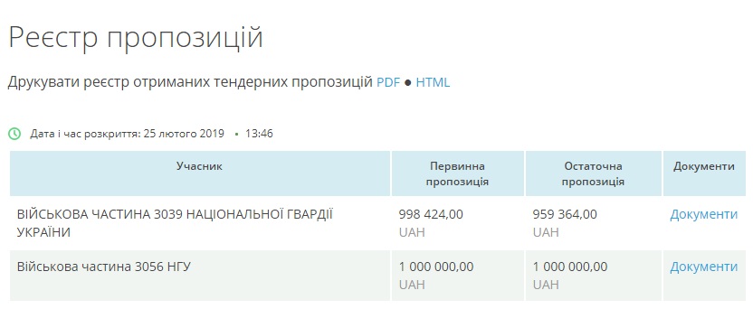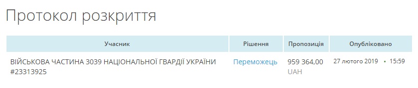 Победителем стала военная часть 3039 НГУ с окончательной предложенной суммой в 959 364 гривен, хотя первичное предложение было — 998 424 гривны.