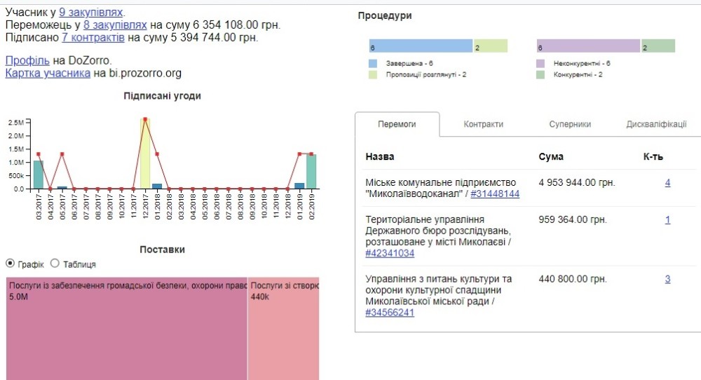 Отметим, что по данным, которые предоставляет сайт, она участвовала в 9 закупках и победила в 8-ми из них на общую сумму в 6 354 108 гривен.