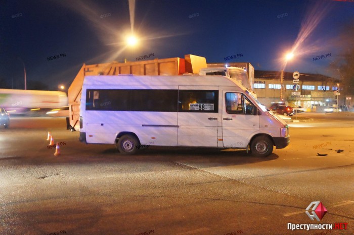 В Николаеве, в среду, 13 марта, на перекрестке улицы Пограничная и Садовая произошло ДТП с участием маршрутного такси «Volkswagen», курсирующего по маршруту 88, и мусоровоза.