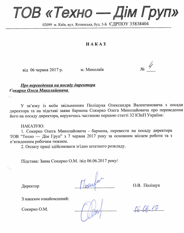 Учредителем и директором “Техно-Дім Груп” является Олег Сокирко, который ранее работал в этой компании на должности бармена. Об этом свидетельствует приказ предприятию от 6 июня 2017 года, где сказано о переводе Сокирко с должности бармена на должность директора.