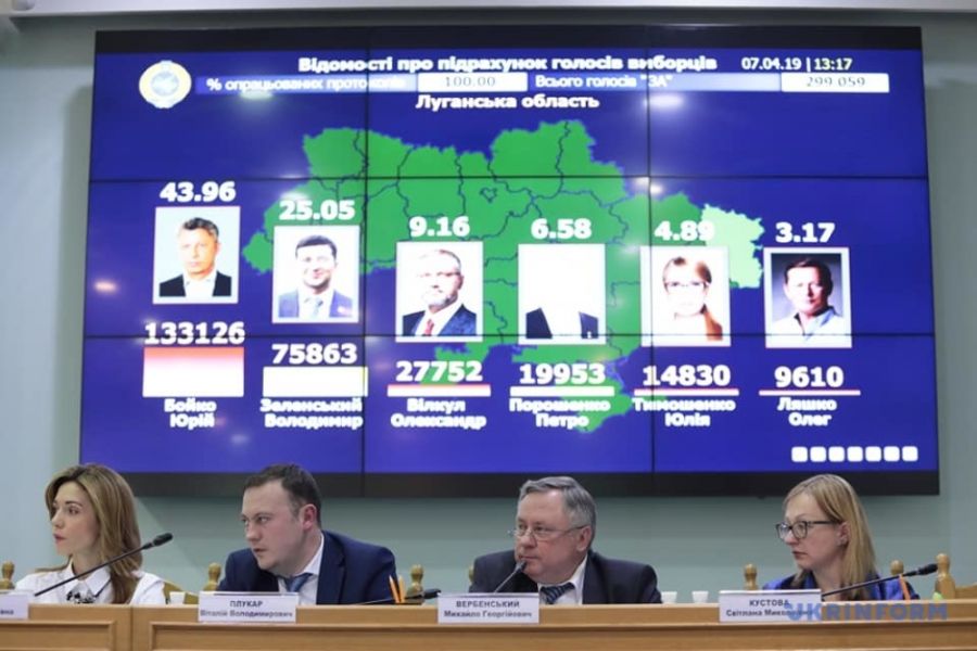 Согласно подсчетам, за Зеленского голоса отдали 30,24% избирателей. За Порошенко проголосовали 15,95% избирателей. Юлия Тимошенко набирает 13,4%, Юрий Бойко — 11,67%, Анатолий Гриценко — 6,91%, Игорь Смешко — 6,04%, Олег Ляшко — 5,48%. Александра Вилкула поддержали 4,15% избирателей, Руслана Кошулинского — 1,62%. Другие кандидаты набирают менее 1%.
