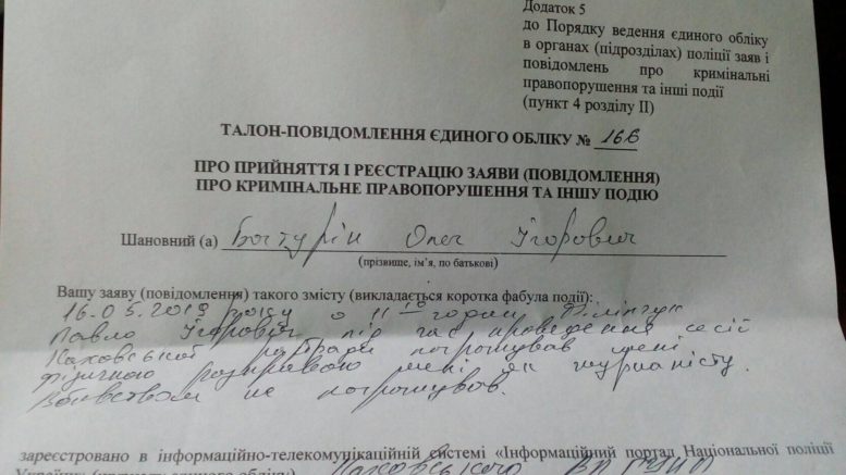 Обратился в полицию с заявлением о совершении депутатом Херсонского областного совета от оппозиционного блока Павлом Филипчуком преступления по ст. 345-1 Уголовного кодекса Украины – угроза насилием в отношении журналиста.