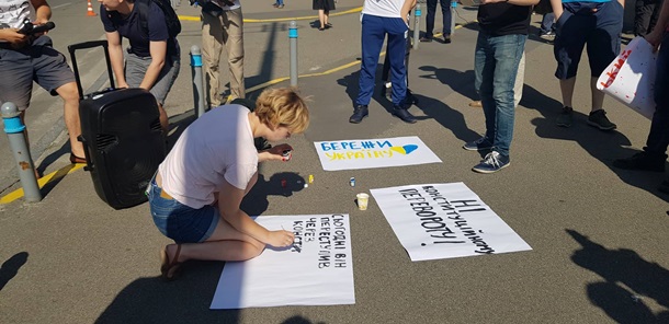 10:00 Протесты под зданием суда. Участники акции держат плакаты с надписями: "Нет, конституционному перевороту", "Зеленский, не оскверняй Конституцию!", "Береги Украину, КСУ!".