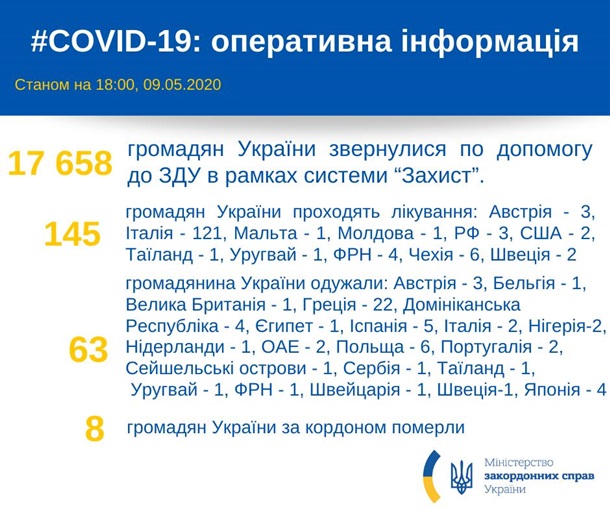 По состоянию на 9 мая за границей от коронавируса лечатся 145 граждан Украины.