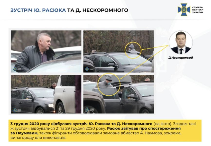 По версии следствия основным мотивом преступления стало то, что Андрей Наумов был препятствием для возвращения Дмитрия Нескоромного на высокую должность в руководстве Службы, а также выступал против назначения отдельных членов екскоманды Нескоромного в СБУ. Фигуранты дела разработали детальный план посягательства на жизнь А.Наумова. Для его выполнения сотрудник АТЦ Ю.Расюк в течение октября 2020 — января 2021 подыскал исполнителей преступления, обеспечил их финансирования, организовал слежку за А.Наумовым.