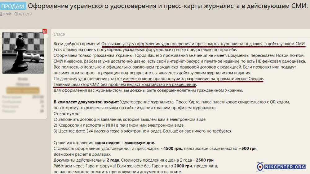 Аналогичная ситуация и с журналистами. Значительная часть таких владельцев оружия не ведут профессиональную журналистскую деятельность, а получили удостоверение по договоренности со СМИ или и вовсе купили его. К примеру, на некоторых форумах предлагают изготовить “под ключ” удостоверение и пресс-карту журналиста действующего печатного издания. Покупателю такой “услуги” достаточно предоставить копию паспорта, фото и заполнить анкету. В случае проверки правоохранительными органами главный редактор данного СМИ подтвердит, что владелец удостоверения является его сотрудником.