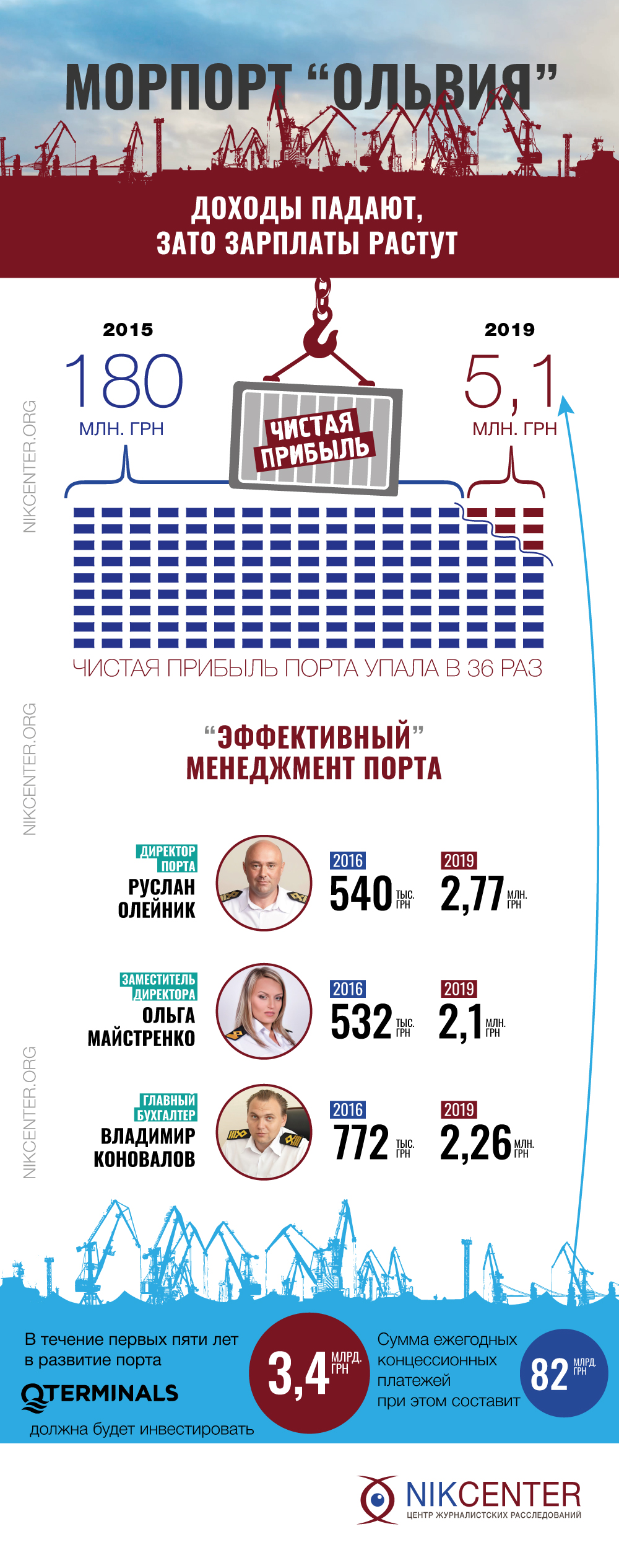 Важно отметить, что появление в 2015-2016 гг. в “Ольвии” новой команды “эффективных” управленцев с самого начала сопровождалось скандалами. Так, еще в 2016 году аудиторы, изучавшие работу предприятия, обнаружили, что непрофессиональные действия тогдашнего директора порта Александра Басюка и его заместителя Руслана Олейника привели к замораживанию на счетах банков “Столичный” и “Укринбанк” средств порта в размере 77 млн. грн. В своих выводах ревизоры указали, что “управленческие решения не были направлены на защиту экономических интересов предприятия”.