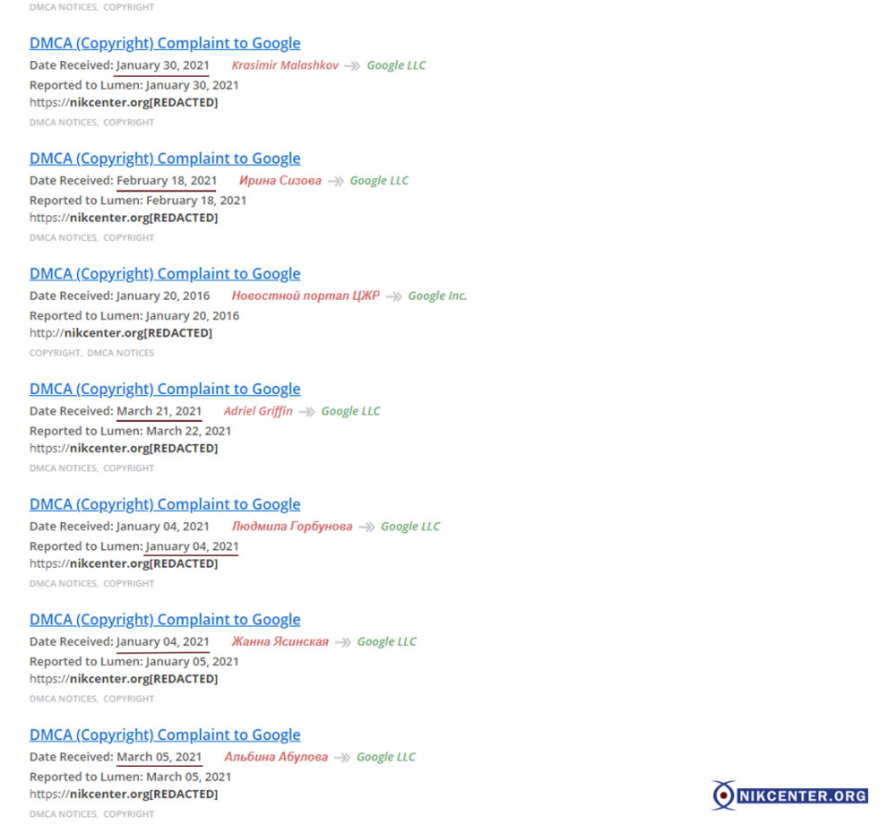 Также на эти публикации неоднократно жаловались в Google, чтобы поисковик снял их с индексации. По такой схеме в 2019 году удалили из поисковой системы критические материалы Центра о бизнесменах Алексее Пелипасе и Владиславе Чайке, который в 2020 году стал депутатом Николаевского горсовета. Для этого на сомнительных сайтах дублировали содержание оригинальных материалов Центра, а затем подавали жалобы о нарушении авторских прав.
