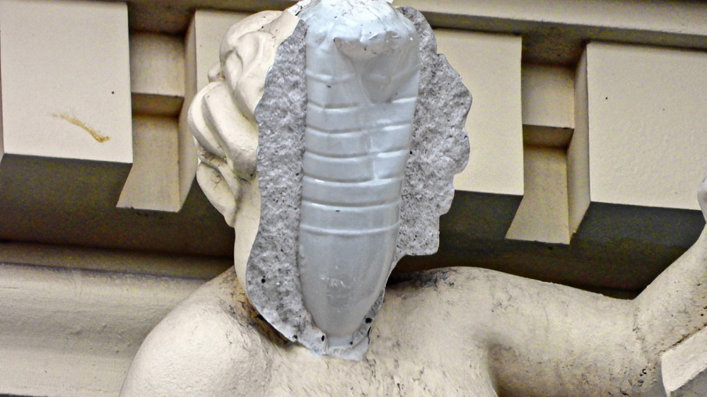 Вчера Евгений Сокольский опубликовал фото одной из скульптур, которая лишилась половины лица. В оставшейся части угадываются очертания пластиковой бутылки.