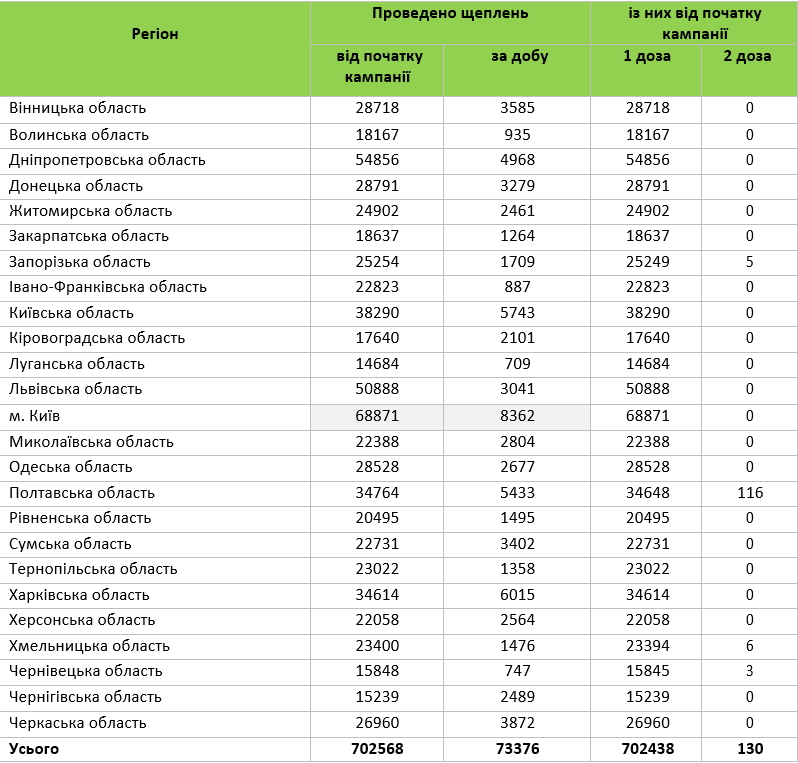 Наибольшее количество прививок за предыдущие сутки была проведено в Киеве — 8362, наименьшее на Луганщине — 709.